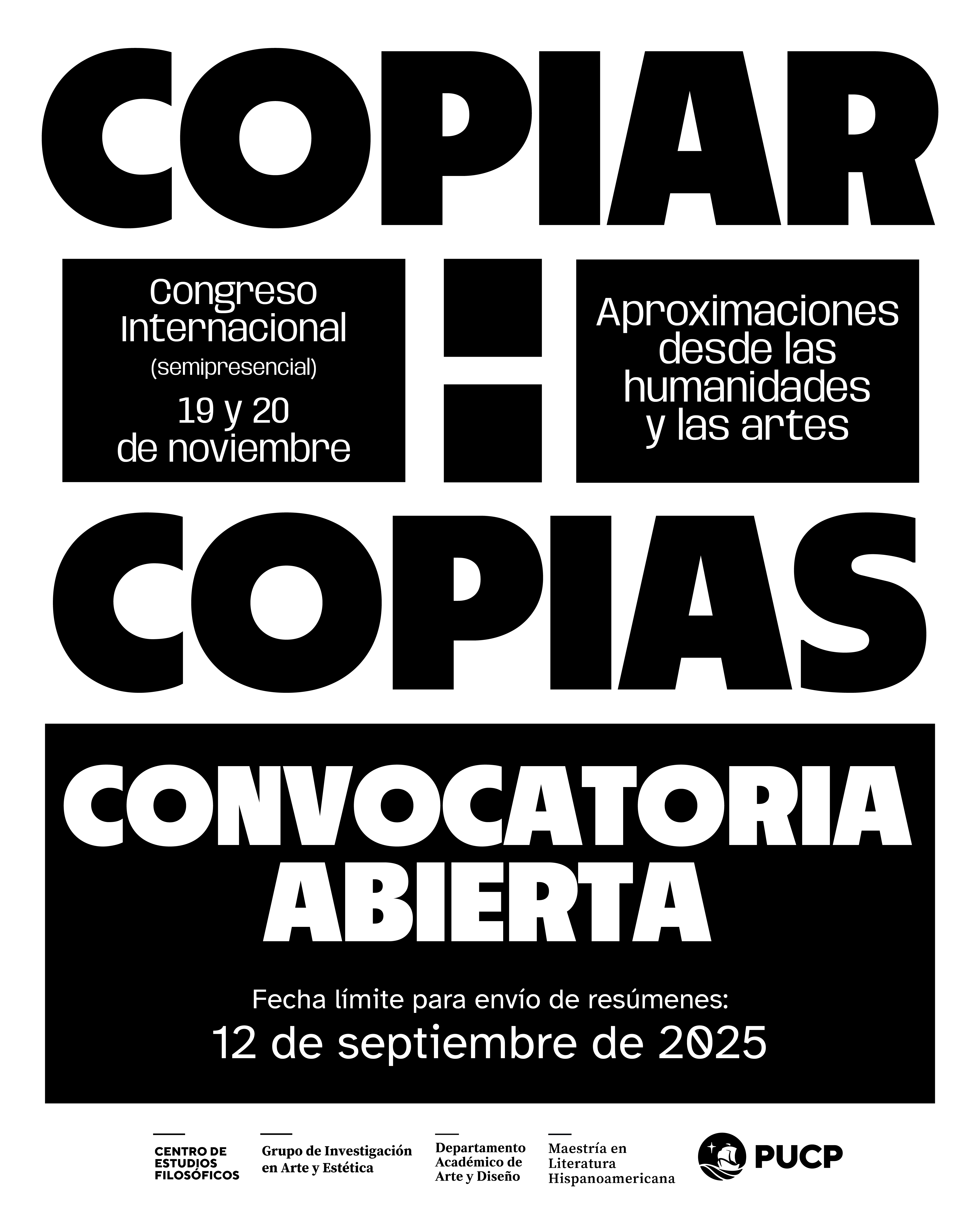 Los días 19 y 20 de noviembre de 2025 se realizará el Congreso internacional «Copiar: copias: aproximaciones desde las humanidades y las artes». El evento será híbrido, en el campus de la PUCP y vía Zoom, y está dirigido a investigadores en temas de arte, literatura, filosofía y humanidades en general.