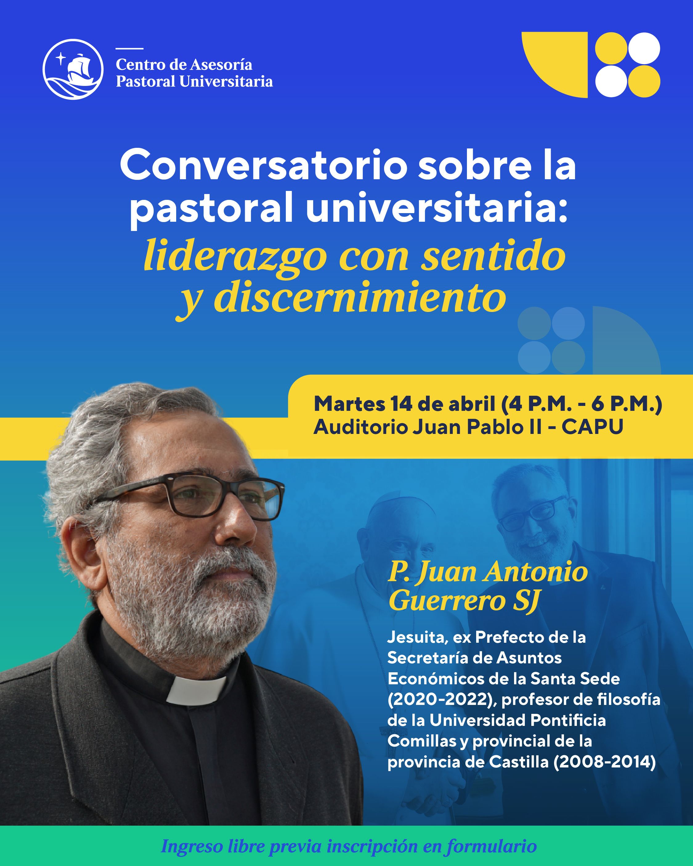 Te invitamos a ser parte de este conversatorio con el P. Juan Antonio Guerrero SJ, jesuita, ex Prefecto de la Secretaría de Asuntos Económicos de la Santa Sede (2020-2022), profesor de filosofía de la Universidad Pontificia Comillas y provincial de la provincia de Castilla (2008-2014).