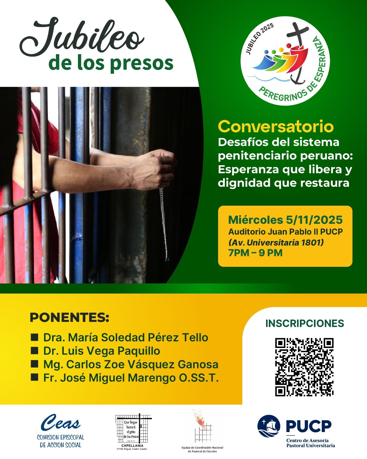 En el marco del Jubileo de los Presos, la Comisión Episcopal de Acción Social (CEAS), el Equipo de Coordinación Nacional de Pastoral Carcelaria, la Pastoral Castro-Castro y el Centro de Asesoría Pastoral Universitaria (CAPU PUCP) organizan un conversatorio orientado a reflexionar sobre la situación actual del sistema penitenciario peruano y los caminos posibles hacia una justicia que restaure y humanice.