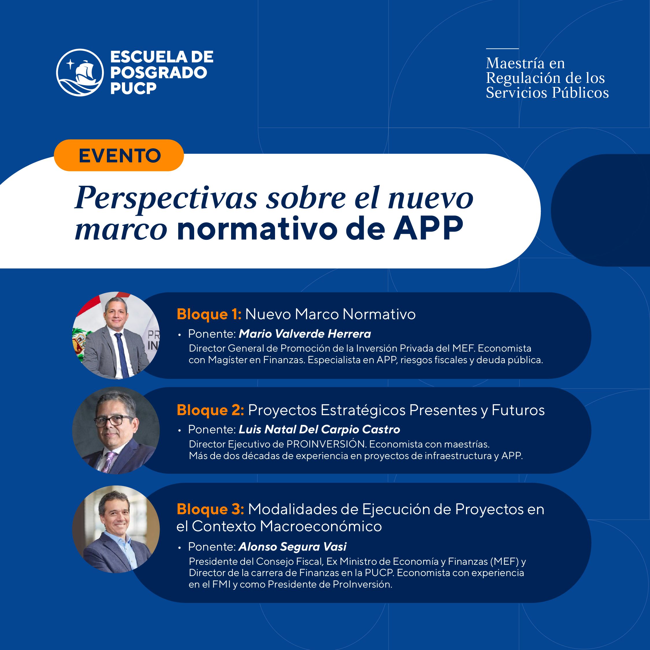 Esta conferencia sobre "Perspectivas sobre el nuevo marco normativo de APP" se organiza en un momento clave para la reactivación de la inversión en infraestructura, en un contexto de restricciones fiscales y de fortalecimiento de la confianza entre el sector público y privado. Busca generar un espacio de análisis y diálogo entre especialistas, autoridades y académicos sobre los recientes cambios normativos en el modelo APP, sus implicancias y las oportunidades que ofrece para impulsar proyectos sostenibles y competitivos en el país.