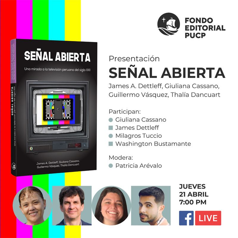 Este jueves 21 de abril a las 7:00 p.m. (Lima), presentaremos a través del Facebook Live del Fondo Editorial PUCP el libro “Señal abierta. Una mirada a la televisión peruana del siglo XXI”, de los autores James A. Dettleff, Giuliana Cassano, Guillermo Vásquez y Thalía Dancuart.